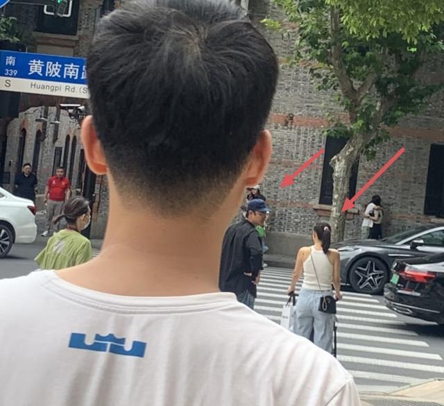 他的老婆穿了一件白色背心搭配宽松型牛仔裤,背着挎肩包,扎着高马尾,身材看起来非常不错,肩膀很宽,背很薄,应该平时有经常性健身。