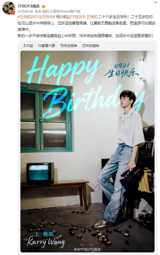 TFBOYS 组合官方账号在零点准时发布生日祝福,文案满含深情:“祝小凯二十六岁生日快乐!二十五岁的你,在见山逐水中持稳琢心,迈步坚定攀登高峰,让勇毅无畏融进角色里,把追梦闪光唱进旋律中。新的一岁开启惊喜宝藏奔赴心中所想,将未来绘就理想模样,在成长中创造更多精彩!” 字里行间,回顾了王俊凯过去一年在演艺事业与音乐道路上的拼搏与成长,也寄托了对他新一岁的美好期许。