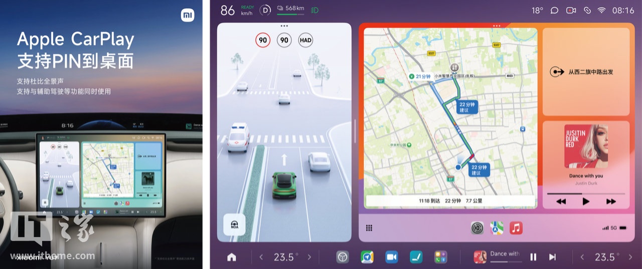 据介绍,小米 SU7 车主中有超过 50% 使用苹果手机,于是小米汽车依托自研的柔性桌面框架,让 Apple CarPlay 可以像原生应用一样,以卡片形式 Pin 在桌面上,并支持自由拖拽和 1/3、2/3 窗口缩放。这一功能已通过 OTA HyperOS 1.10.0 陆续向小米 SU7 及 Ultra 全系车型推送。