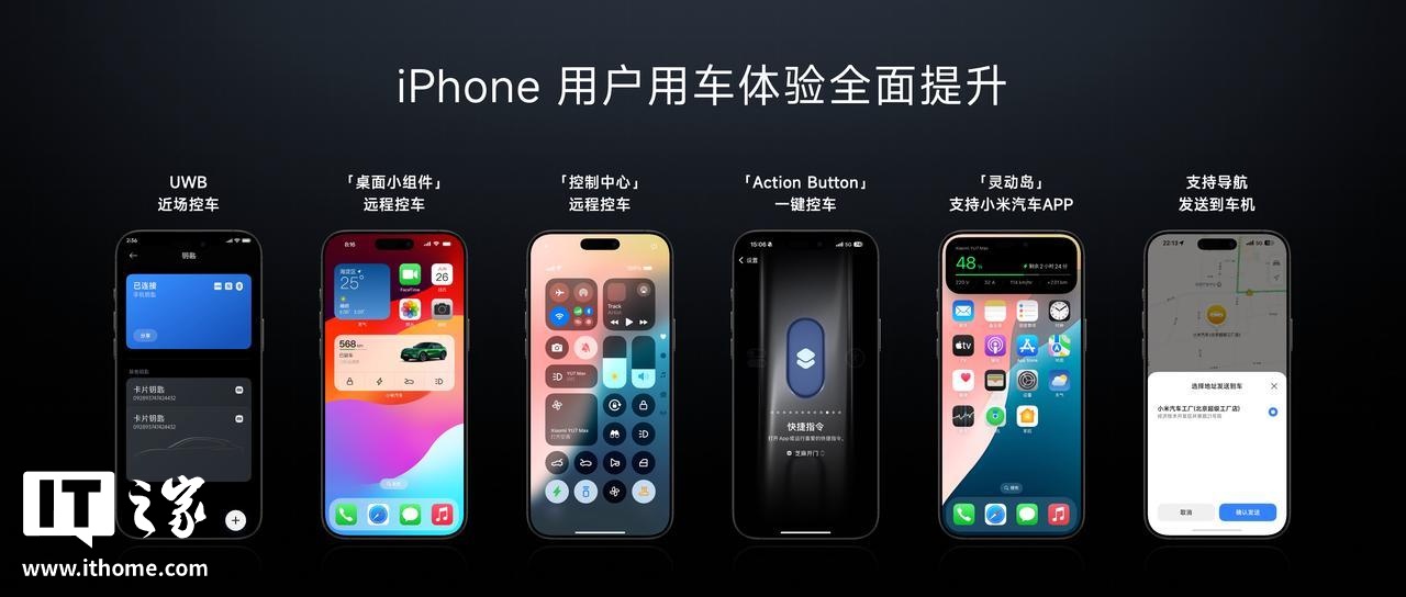 其他方面,小米汽车利用 iPhone 硬件能力,落地 UWB 超宽带数字钥匙;可通过锁屏组件、桌面小组件、Action Button、Siri 控车;系统可自动精准识别用户分享至车机的图片地址信息,并发起精准导航;可通过小米手表或者 Apple Watch 解锁车辆、开启空调、查看车位;可用 iPad 进行车控调节等。