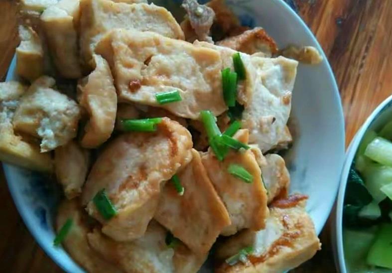 干煎豆腐,做法更简单。豆腐切块,扔进油锅煎到两面金黄,加点水稍微焖一下,焦脆的皮变得软乎乎,出锅撒点葱花。婆婆说,这菜省油又省事,小时候家里连肉都舍不得买,这豆腐就是顶饱的“硬菜”。老公夹了一块,嚼得慢吞吞,像是舍不得咽下去。