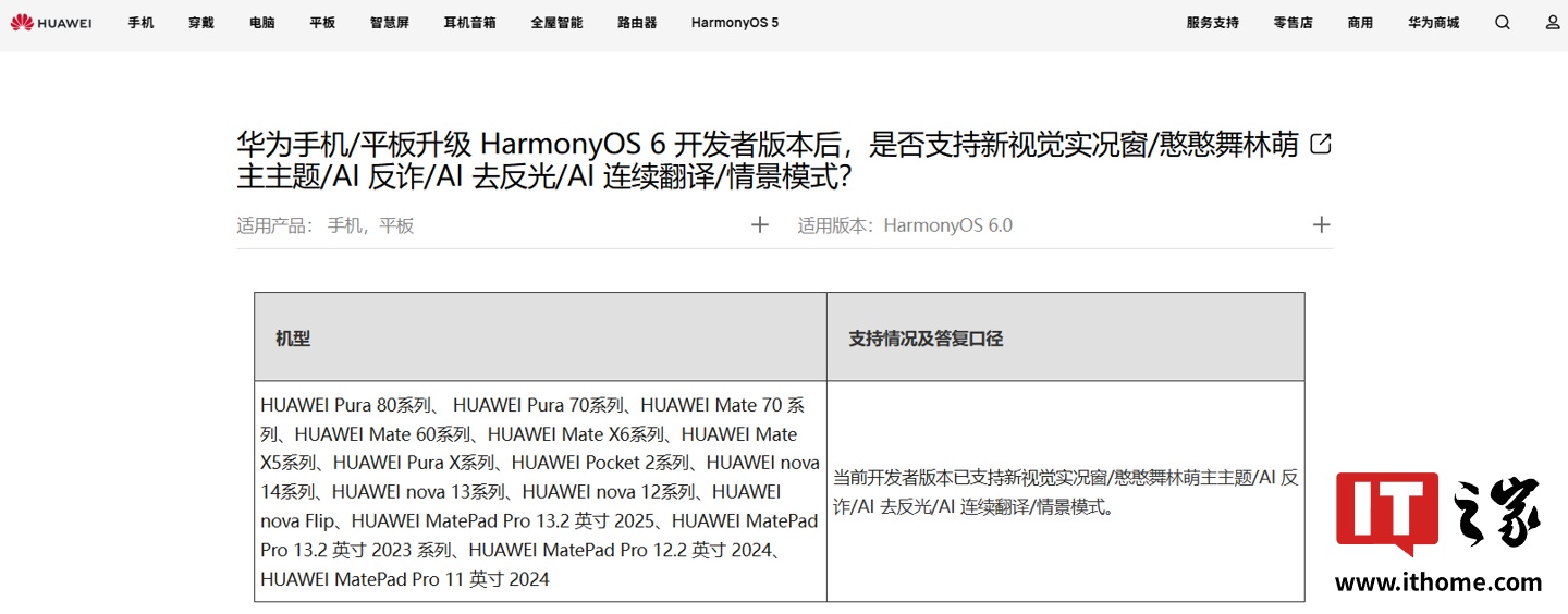 华为官网显示,华为 Mate 60、Pura 70 系列等手机升级 HarmonyOS 6 开发者版,支持 AI 反诈 / AI 去反光 / 情景模式等功能。IT之家附功能适配详情如下: