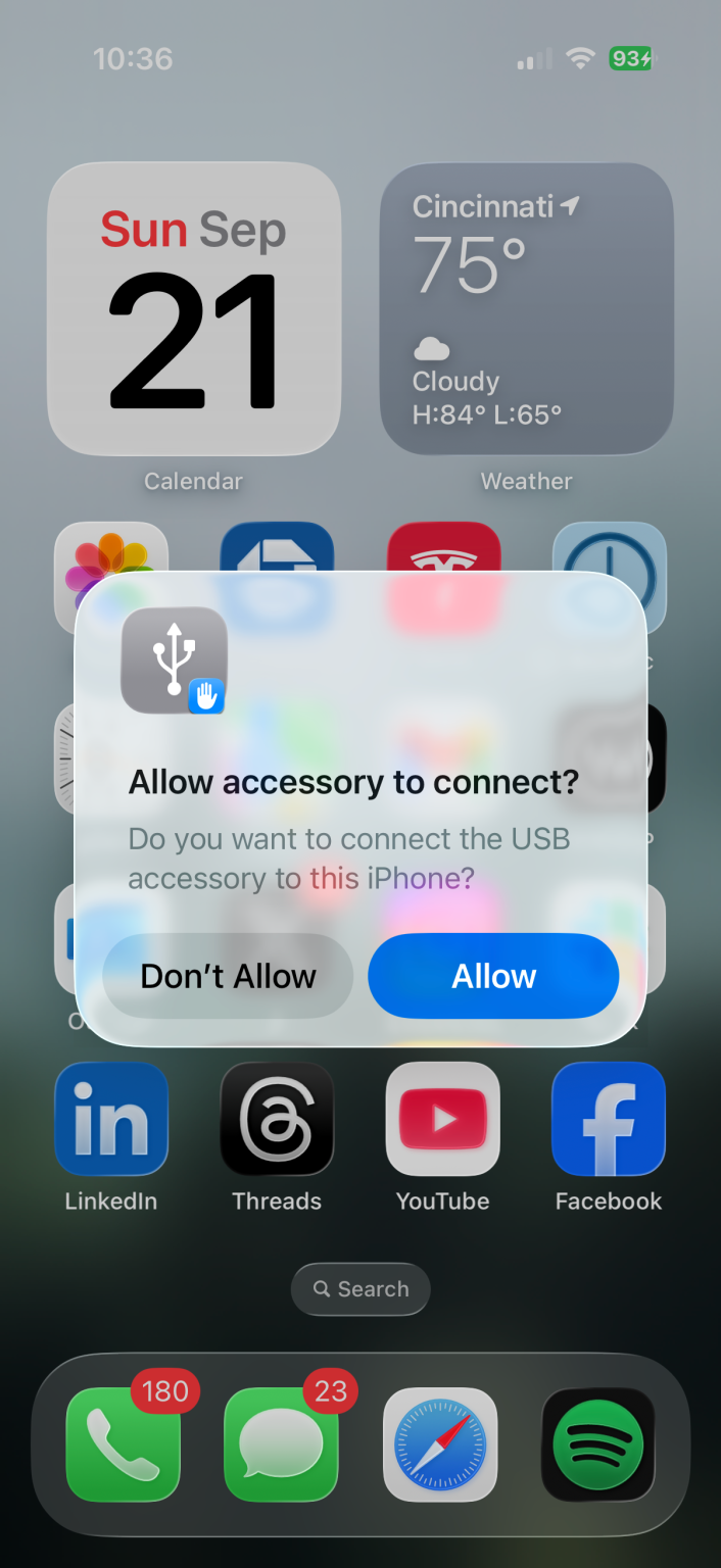 具体来说,在 iOS 26 中,每当用户用数据线连接配件或电脑时系统都会弹窗,让用户选择是否允许数据传输: