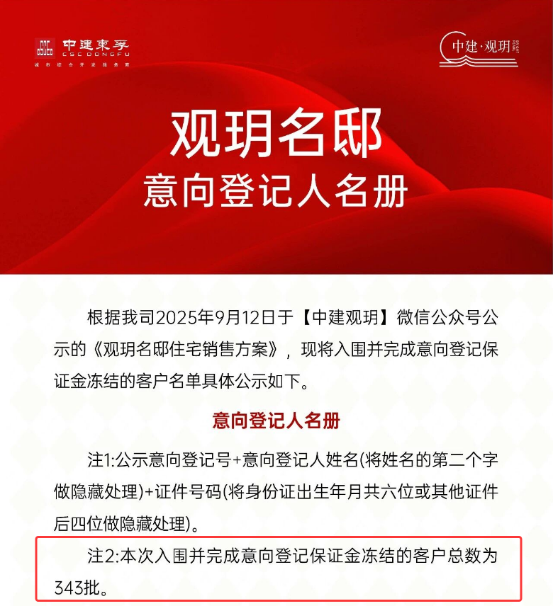 开盘前两天,项目公布意向登记名单,共343批客户冻资入围,冻资比例为1:1.82。