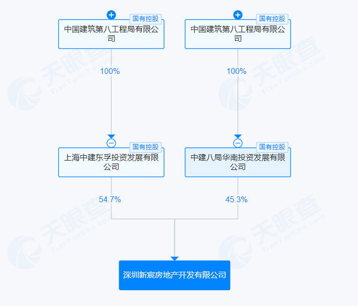 股权上,该公司由上海中建东孚投资发展有限公司、中建八局华南投资发展有限公司分别持股54.7%、45.3%。