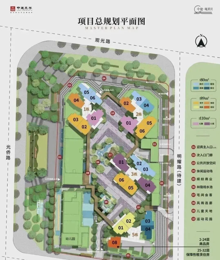 根据规划,中建观玥名邸的总建面约11.5万㎡,其中包括约7.2万㎡住宅,2000㎡商业,2150㎡幼儿园,以及其他公配。住宅方面,观玥名邸共计820套房源,其中租赁型保障房101套,可售商品房住宅719套。规划停车位约900辆。