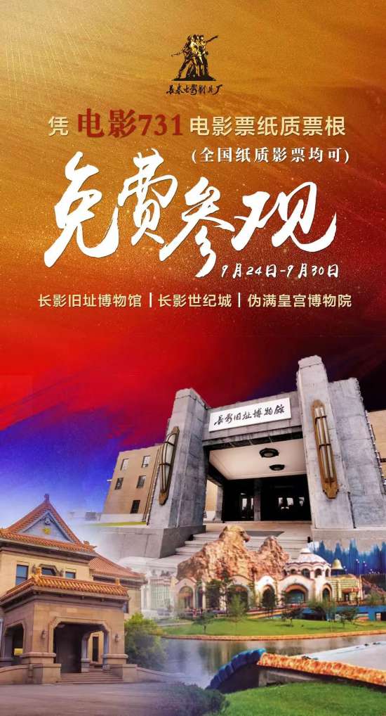 关思聪 电影《731》正在热映 9月24日至9月30日 游客持电影《731》观影票根 可享免费参观游览 ↓↓↓ 国家4A级旅游景区、国家工业遗产长影旧址博物馆 国家5A级旅游景区长影世纪城 国家5A级旅游景区伪满皇宫博物院 国家4A