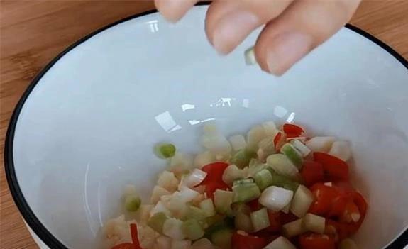 调料是这道菜的精髓。拿四瓣大蒜,剁成蒜末。四根小米辣,切成小圈,喜欢辣的可以多加点。葱白切末,香菜切段,这些小料别看不起眼,少了它们味道就不对劲。准备一个碗,把这些都放进去。