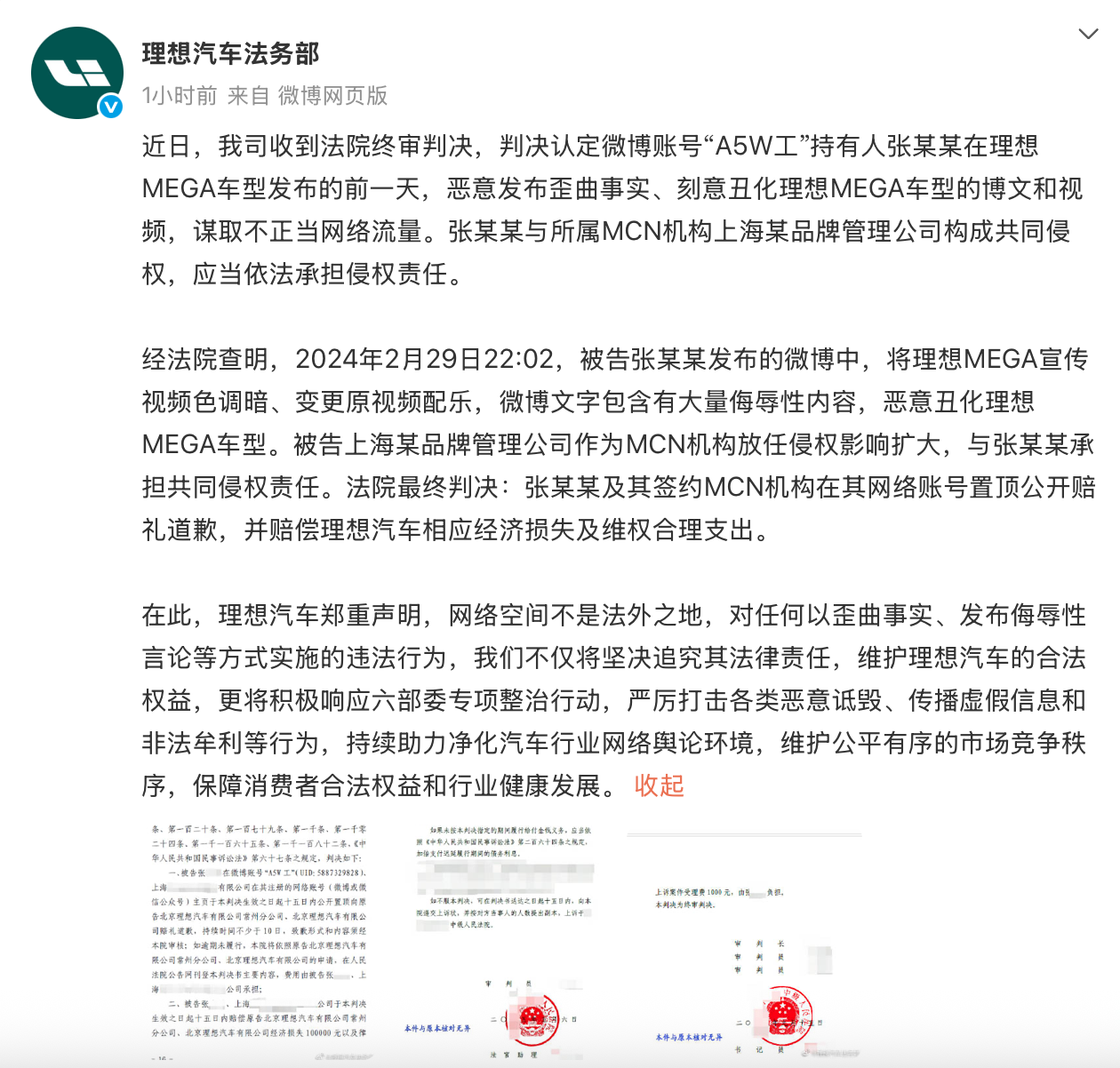 9月22日,理想汽车法务部发文称,近日,公司收到法院终审判决,判决认定微博账号“A5W工”持有人张某某在理想MEGA车型发布的前一天,恶意发布歪曲事实、刻意丑化理想MEGA车型的博文和视频,谋取不正当网络流量。张某某与所属MCN机构上海某品牌管理公司构成共同侵权,应当依法承担侵权责任。
