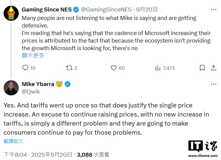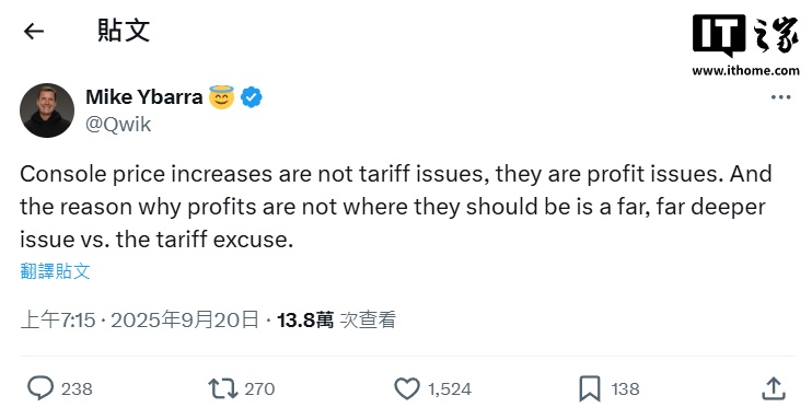 IT之家 9 月 23 日消息,前暴雪娱乐总裁 Mike Ybarra 今天在 X 平台发文,聊及微软 Xbox 游戏机的涨价政策。