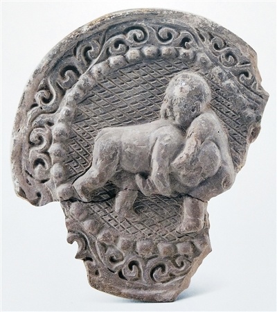 遗址展示馆内,战国时期树木鸟兽纹瓦当、汉代“富乐未央,子孙宜昌”铭文砖、北魏角抵瓦当等建筑构件,诉说着古城的千年繁华。树木鸟兽纹瓦当正中有一株挺拔的树,弧形树冠向上舒展,枝叶两侧对称雕刻振翅飞鸟,树干上的两只猴子呈攀缘姿态相对而立,树根部对饰两只山羊,造型质朴。内蒙古师范大学北疆文化研究中心主任陈永志介绍:“树冠飞鸟、猴子攀树题材源自中原地区灵魂升天、王侯将相等文化元素,而对羊纹又具有草原游牧民族风格。这件瓦当生动体现了中原文化与北方草原文化的交融。”