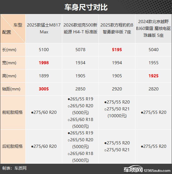 车身尺寸方面,四款车型虽然官方定位不同,但整体表现比较接近。参数方面,定位为大型SUV的猛士M817,在车身宽度和轴距方面占优,是四款车型中唯一一款轴距超过3000mm的车型。方程豹豹8拥有四款车型中最长的车身长度,北京越野BJ60雷霆则是在车身高度方面表现最好。此外,除坦克500新能源标配19英寸轮毂外,其余三款车型均标配20英寸轮毂,视觉效果更大气;同时,猛士M817轮胎扁平比更高,理论上会拥有更好的缓冲能力,耐用性也更好。