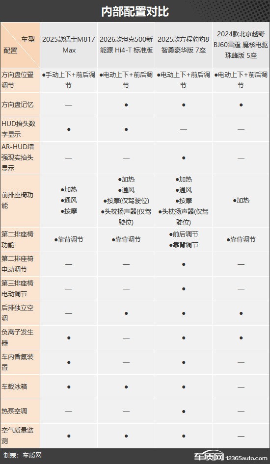 内部配置方面,方程豹豹8表现最好,独享第二/三排座椅电动调节、热泵空调和AR-HUD增强现实抬头显示的同时,还配备车载冰箱、方向盘记忆、前排座椅加热/按摩和通风功能。相比之下,价格最低的北京越野BJ60雷霆在这一环节表现不佳,缺失了多项实用性配置。