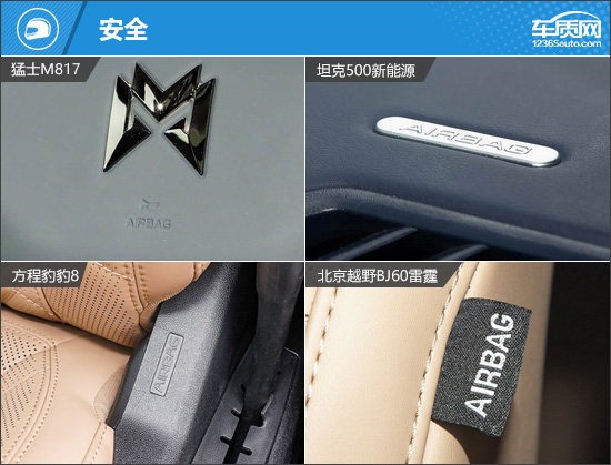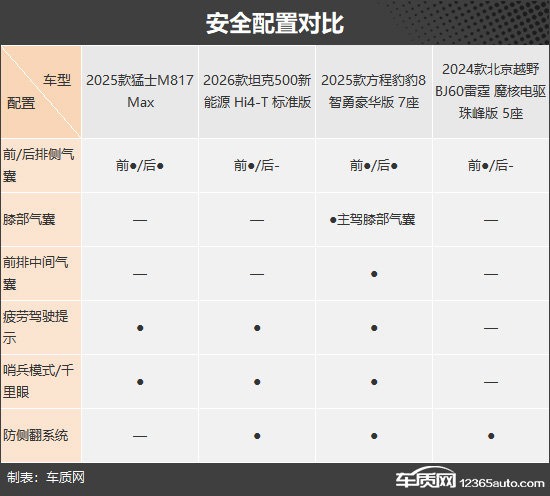 安全配置方面,方程豹豹8在四款车型中整体表现最佳,独享主驾膝部气囊、前排中间气囊,并配备前/后排侧气囊、防侧翻系统等,可以提供更全面的安全保护。相比之下,北京越野BJ60雷霆在安全配置表现拉胯,配置缺失较多,与另外三款车型拉开明显差距。