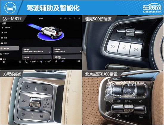 驾驶辅助配置方面,猛士M817相对更加完善,配备多项实用功能,如夜视系统、遥控泊车、辅助变道等。相比之下,坦克500新能源和北京越野BJ60雷霆在驾驶功能配置方面表现拉胯,不及另外二款车型。