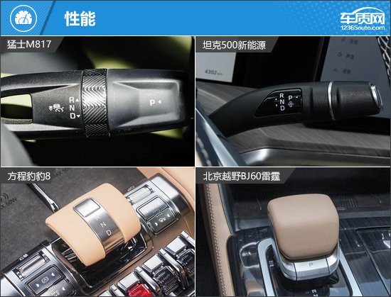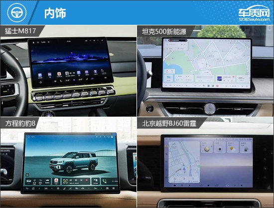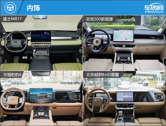 内饰方面,或许是因为定位比较接近,四款车型的设计风格也非常相似,均通过大量平直线条的应用,带来更强的力量感,与外观风格统一。为了提升科技感,给乘客带来更好的用车体验,方程豹豹8和北京越野BJ60雷霆还配有副驾娱乐屏,猛士M817和坦克500新能源则是略显传统的设计,仅配备悬浮式中控屏。换挡形式方式,猛士M817和坦克500新能源采用非常精致的电子式怀挡换挡,方程豹豹8和北京越野BJ60雷霆采用电子挡把换挡。
