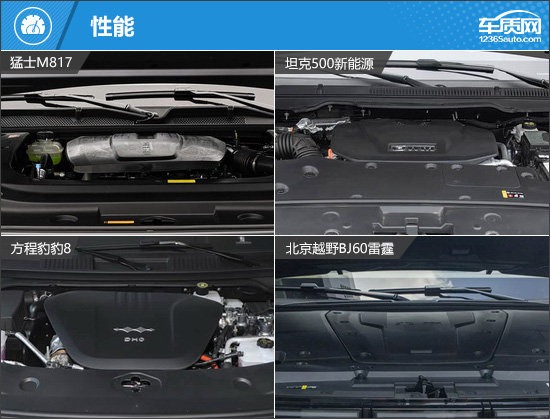 动力方面,猛士M817、方程豹豹8和坦克500新能源均为插电式混合动力,北京越野BJ60雷霆则采用增程式动力。其中,坦克500新能源和方程豹豹8采用排量更大的2.0T发动机,前者还拥有四款车型中最强的发动机最大功率;电动机方面,方程豹豹8的电动机总功率要优于另外三款车型,其官方0-100km/h加速也是四款车型中最出色的。能耗方面,猛士M817表现最佳,拥有四款车型中最低的WLTC综合油耗。