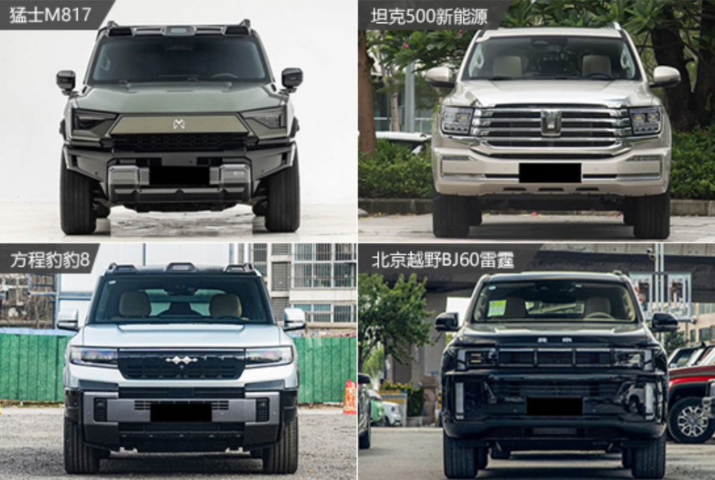 本次挑选的四款车型分别为2025款猛士M817 Max(以下称:猛士M817)、2026款坦克500新能源 Hi4-T 标准版(以下称:坦克500新能源)、2025款方程豹豹8 智勇豪华版 7座(以下称:方程豹豹8)和2024款北京越野BJ60雷霆 魔核电驱珠峰版 5座(以下称:北京越野BJ60雷霆)。在价格方面,四款车型均没有超过38万元,价格最低的北京越野BJ60雷霆只要30.18万元(由于目前图片数量较少,因此部分车型的图片并不是相对应的具体款型)。