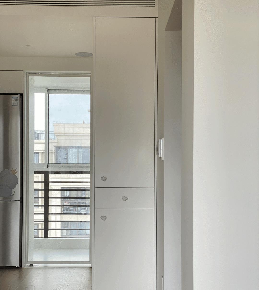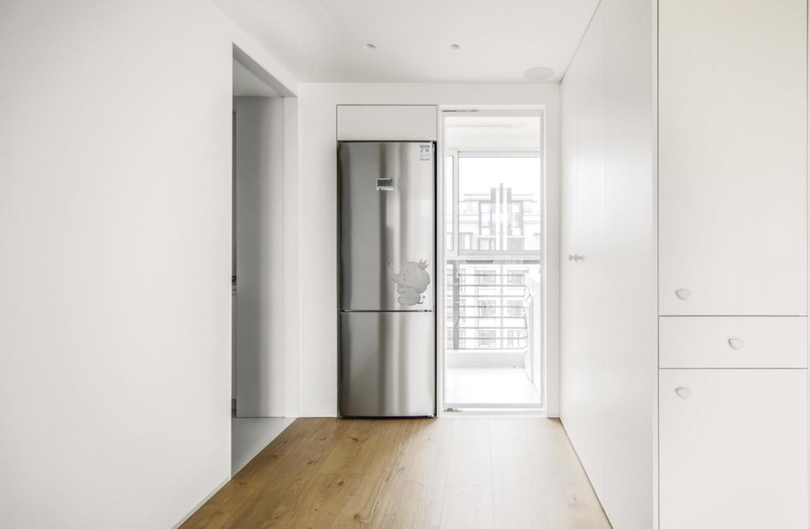 在客厅兼具餐厅功能的情况下,原餐厅基本上做了留白处理,这样一来规避了空间的局促性,二来也赋予了空间更多的想象。而利用北阳台门洞空间内嵌冰箱,也巧妙缓解了厨房的空间压力。