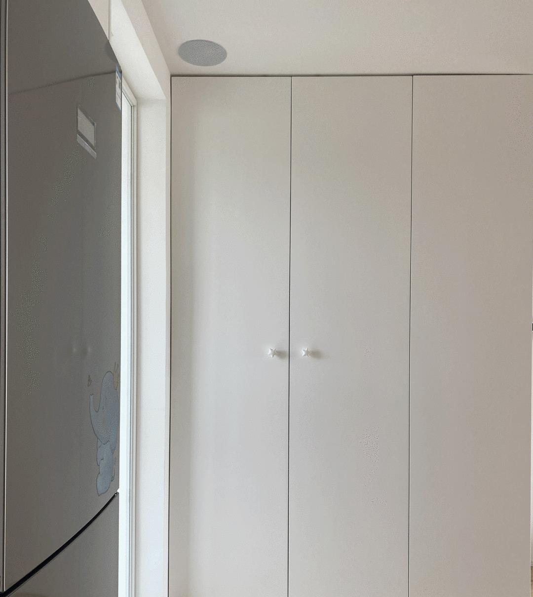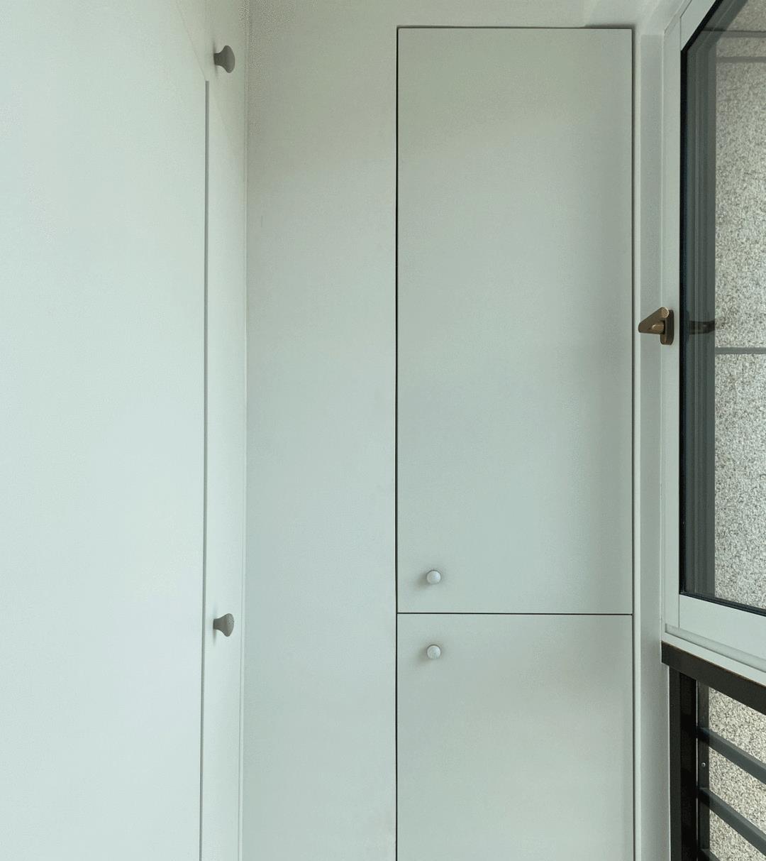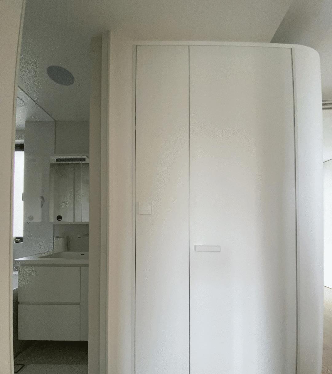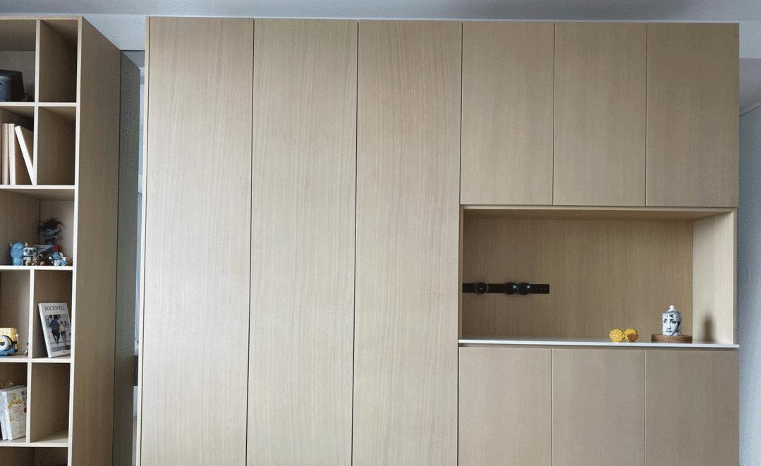 双面柜的另一边,则是对侧面柜储物能力的补充。柜门一门到顶,并安装上钮扣拉手,也在视觉上做到了简约、利落。
