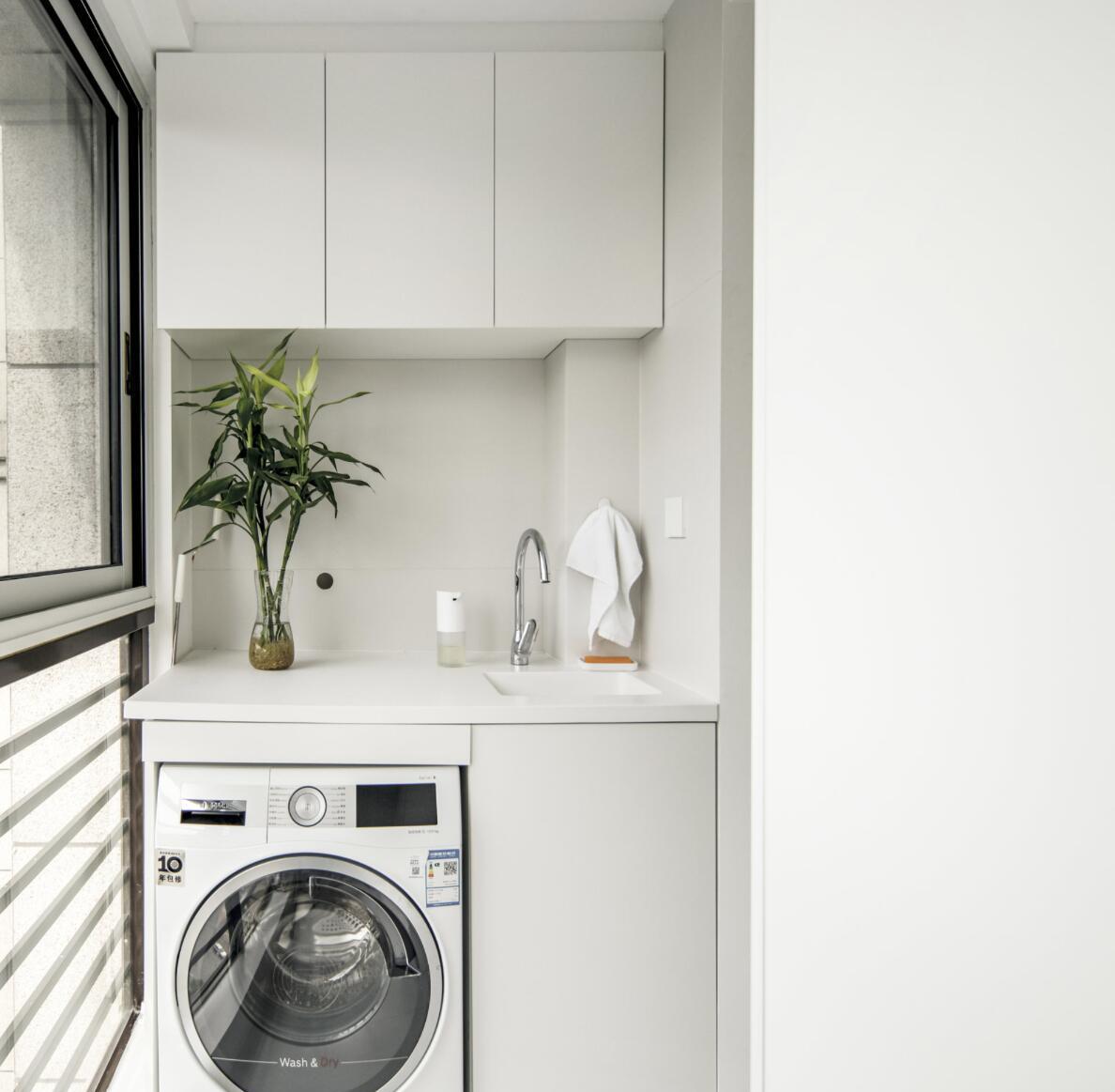 由于房屋位于顶层,北阳台用玻璃做了全封闭处理,也就是我们俗称的阳光房。而空间布局这块,则分别解决了日常洗衣、家政工具的收纳,并且还隐藏了厨房的燃气热水器。