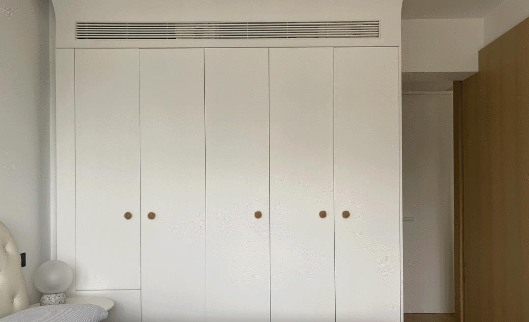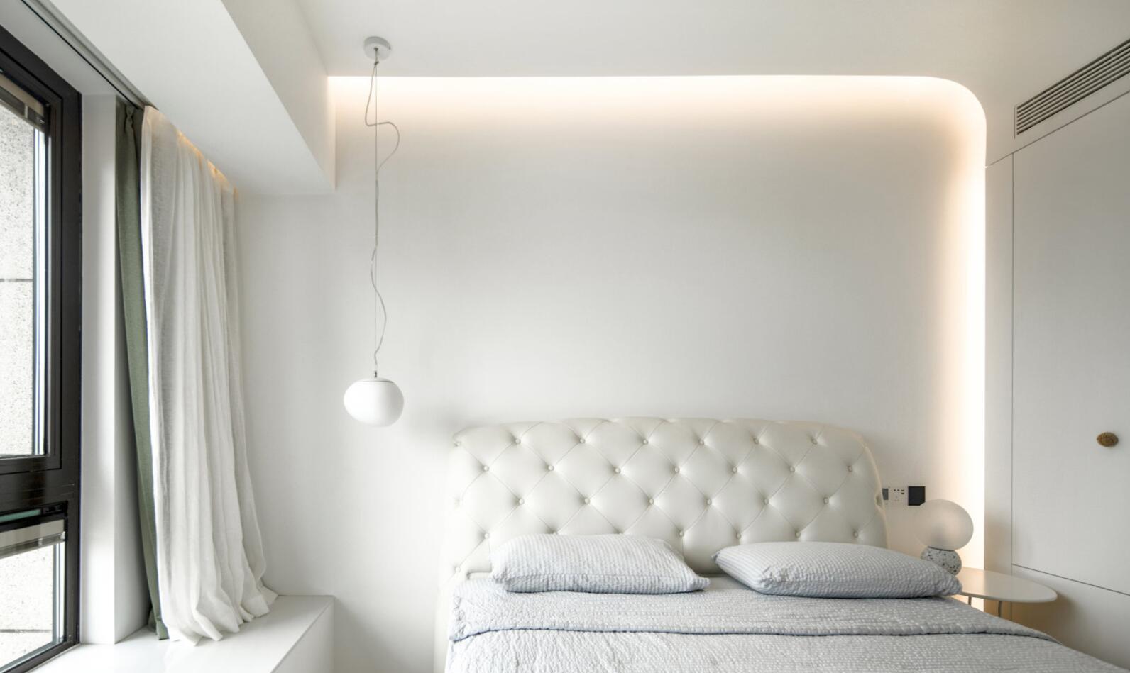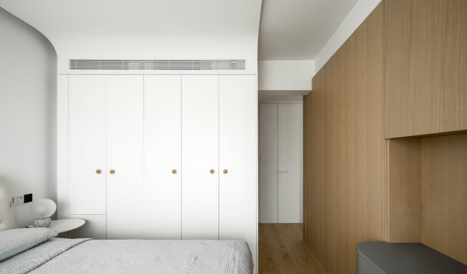 主卧作为家里的睡眠区,舒适性和氛围感是非常重要的。因此,顶面采用弧形的方式与衣柜连接,再暗藏上暖色的灯光,不仅在视觉上造就了一抹优雅的格调,又起到了烘托氛围感的作用。
