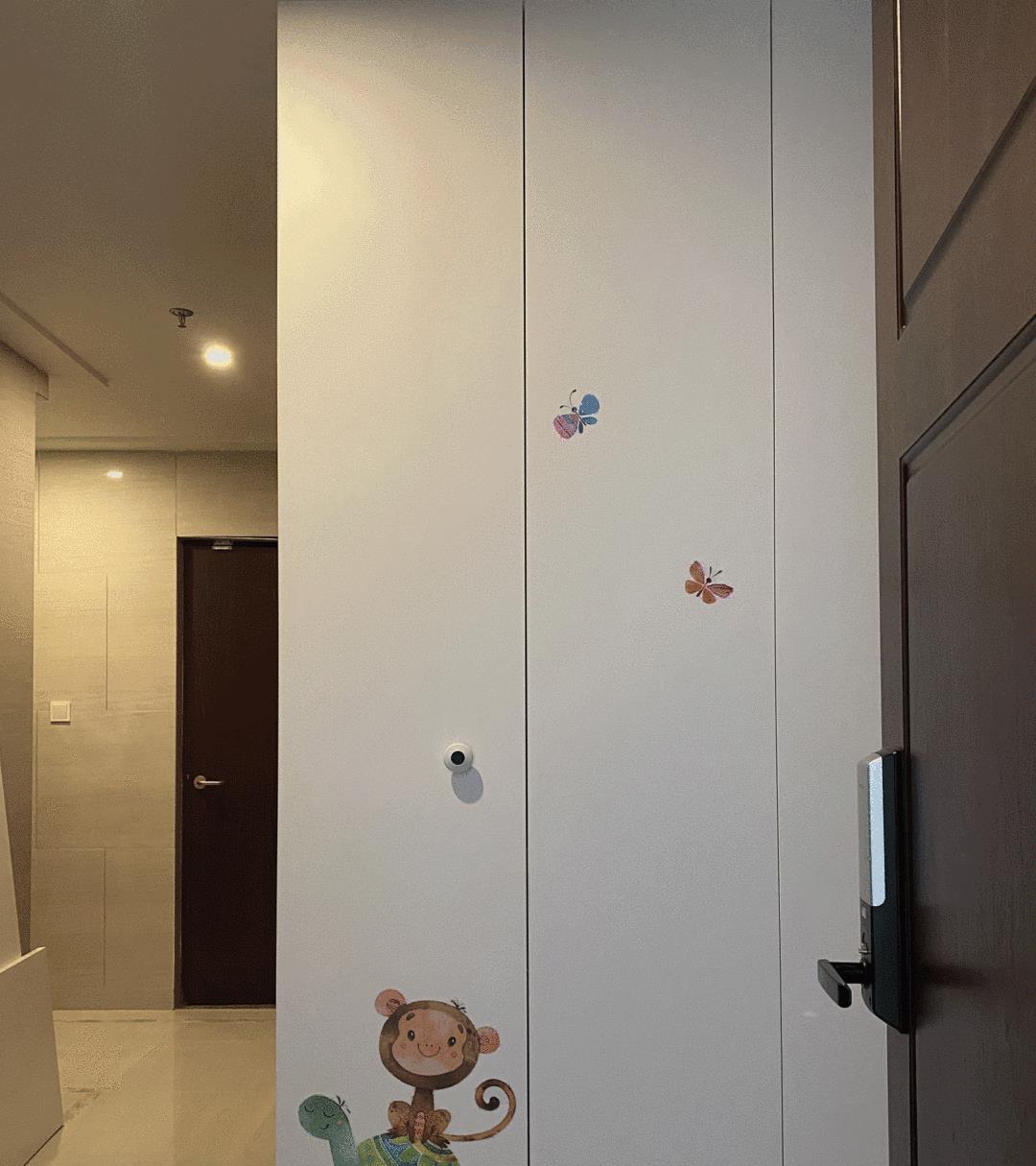在原户型进门就是客厅的情况下,以逆向思维的方式,将玄关区设计在门外的走廊处。不仅充分利用了一梯一户的户型优势,也让入户动线有了一个平缓的过渡。同时,还释放了内部的空间压力,并彻底避免了灰尘带入室内。