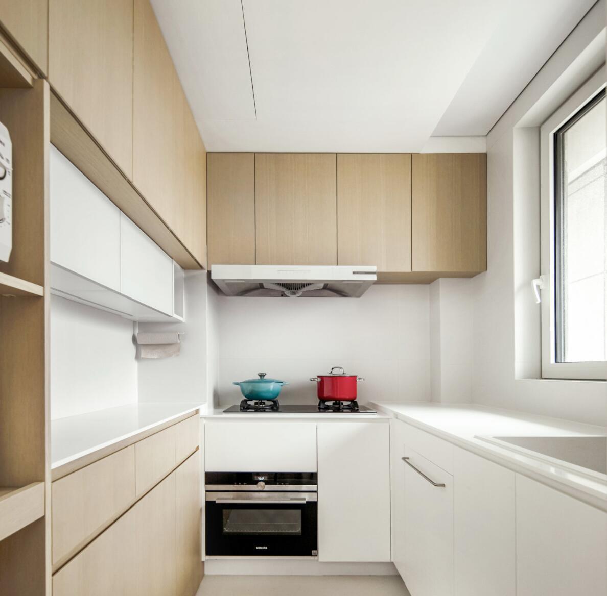 来到厨房,虽说空间面积不大,但还是实现了围合式的橱柜布局。尤其是左侧的双层吊柜设计,更是让空间的每一块空间,都得到了合理利用。当然,为了预留出舒适的活动空间,左侧柜体的深度也做了压缩处理,不过并不影响日常储物使用。
