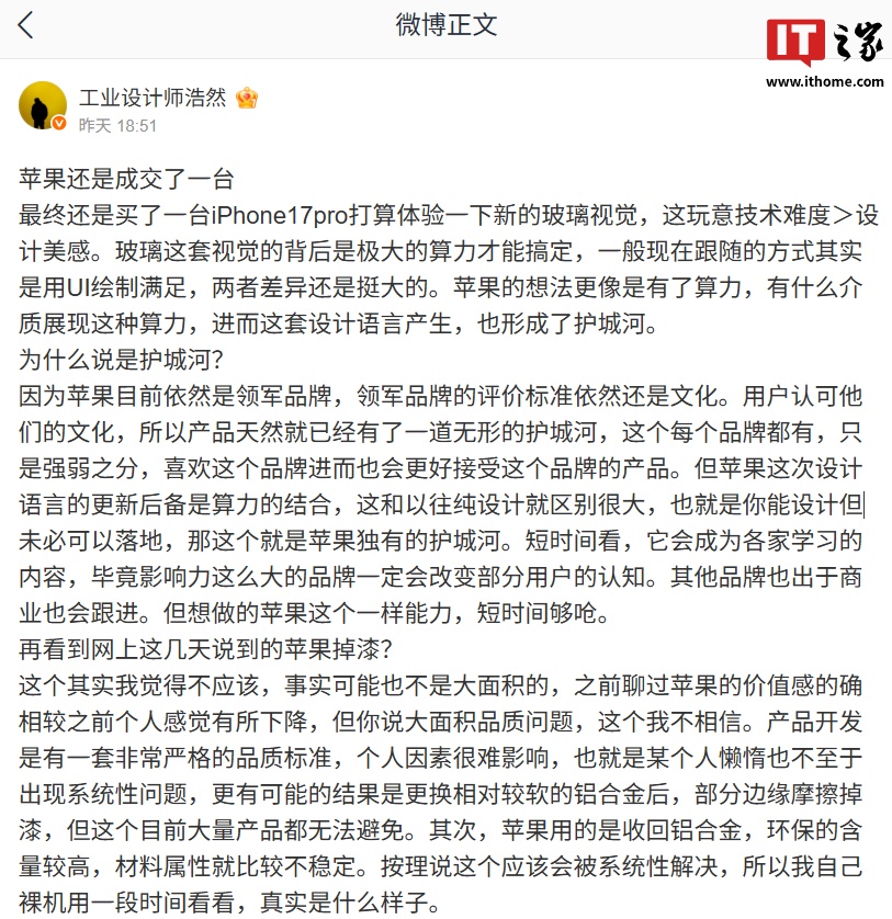 IT之家 9 月 23 日消息,OPPO 工业设计中心总经理刘浩然昨日发文透露自己最终还是买了一台 iPhone 17 Pro 打算体验一下新的玻璃视觉,并表示其技术难度>设计美感,背后是极大的算力才能搞定。此外,刘浩然还谈到了苹果的护城河,以及苹果掉漆的问题。