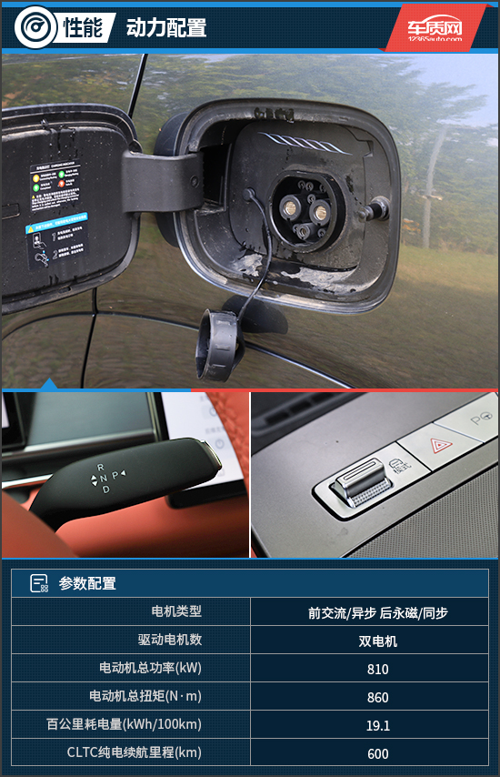 评测车搭载前后双电机,总功率810kW,总扭矩860N·m,CLTC纯电续航里程为600km。超级e平台支持全域千伏高压架构,可实现兆瓦闪充,最高8.4C充电倍率,闪充5分钟,可增加370km的续航里程,并且还提供“双枪充电”,相当于给快充加上“物理外挂”。