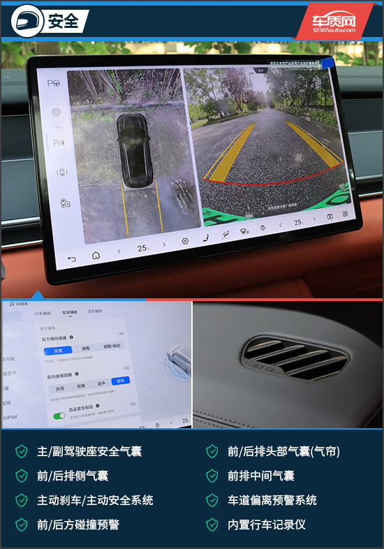 安全配置方面,评测车搭载了丰富的主/被动安全配置。诸如前/后排侧气囊、前/后排头部气囊(气帘)、前排中间气囊、车道偏离预警系统、内置行车记录仪等在评测车上均有配备,可以有效提升行车安全性,为日常行驶保驾护航。