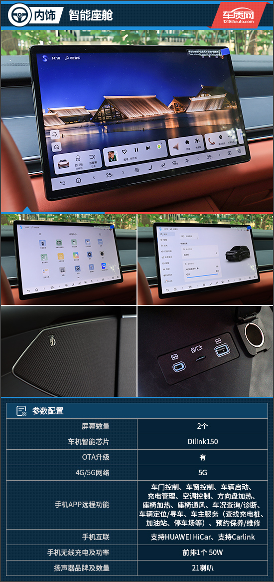 15.6英寸多媒体中控屏+10.25英寸全液晶仪表+AR-HUD抬头显示,形成三屏联动,辅以Dilink150车机芯片,可实现毫秒级响应,提供了流畅的交互体验。此外,全系标配21扬声器的迪声音响系统,与传统车载音响调音不同,其更强调环绕声的营造,整体效果与音乐软件的环绕模式很像,导致低音的下潜深度和混响范围受限,颇有种画蛇添足的感觉。并且在音源播放上,只有车机内置的第三方音乐app才可以享受环绕模式,蓝牙音乐则不支持。