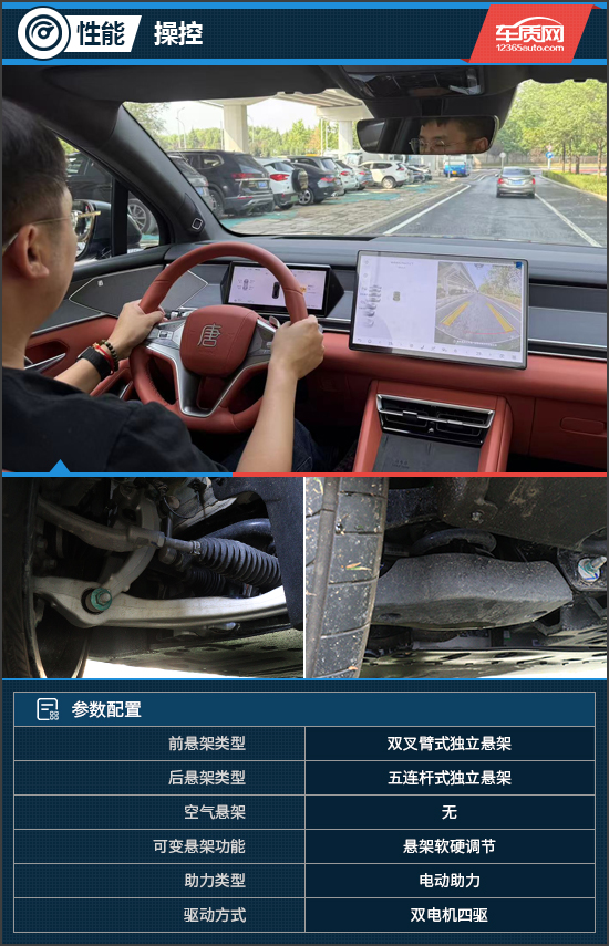 评测车的悬架系统由前双叉臂式独立悬架+后五连杆式独立悬架组成,并配备可软硬调节的可变悬架功能。实际体验,悬架对于路面细碎颠簸处理比较迅速,但会有明显振动传递进车内,尤其是面对减速带等较大坑坎时,更加明显。
