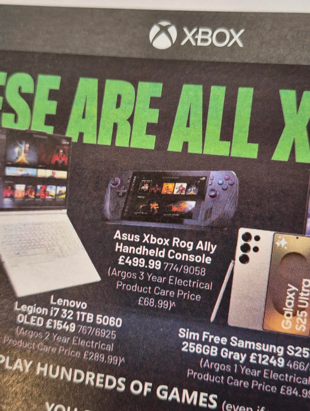 根据玩家分享的实拍图可以看到,英国零售商 Argos 已经摆出了 Xbox Ally 掌机的宣传海报,显示这款掌机售价 499.99 英镑(IT之家注:现汇率约合 4808 元人民币),店内的工作人员还表示,预购将在不久后开启
