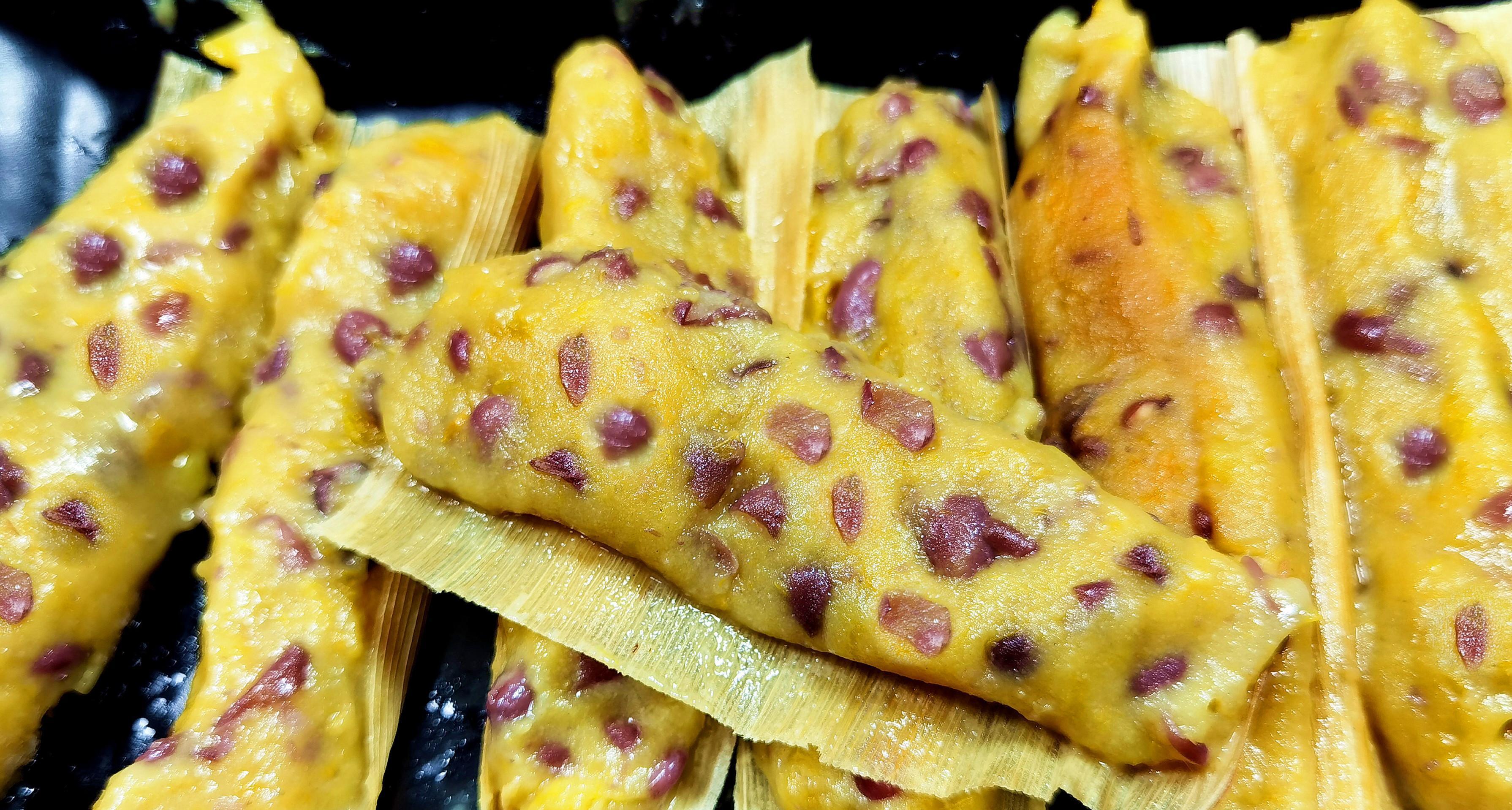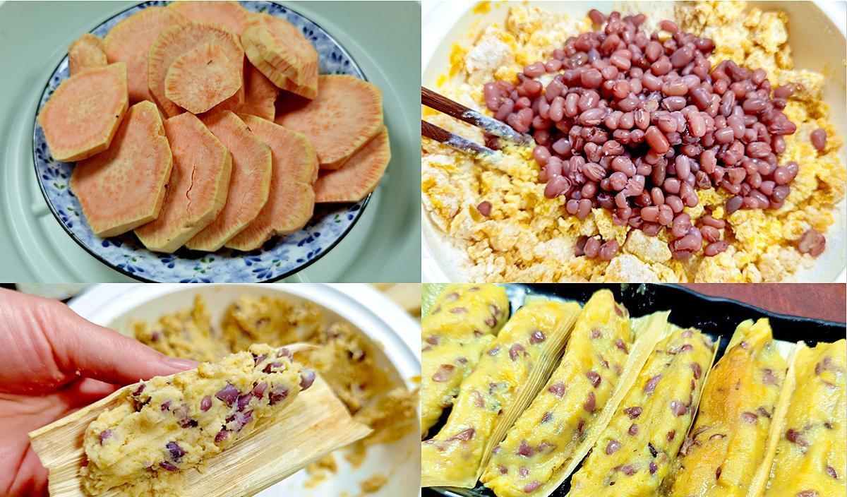 2. 取半碗玉米面、半碗煮软的红小豆(可以提前浸泡煮熟或者用罐头豆),和红薯泥混合在一起。