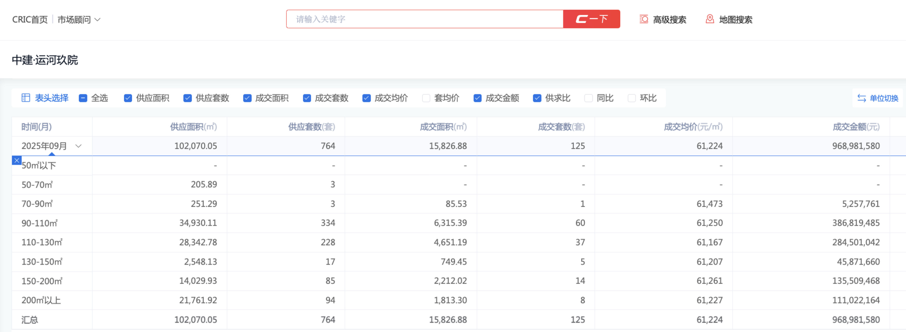 CRIC系统显示,运河玖院125套网签中,90-110㎡面积段为成交主力,有60套,占比近半,成交均价61250元/㎡。
