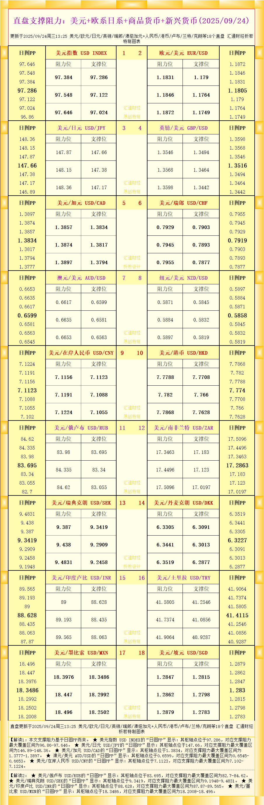 一张图看18个直盘外汇支撑阻力:美元+欧系日系+商品货币+新兴货币(2025年9月24日)