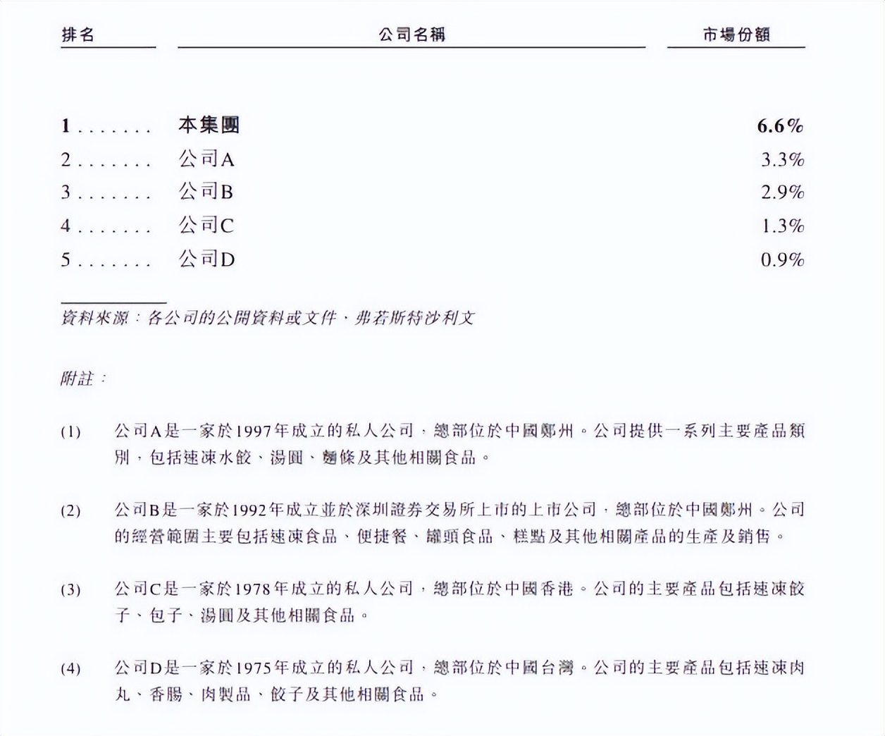 前五大公司市场份额15%。排在第五位的海霸王,成立于1975年。这家台湾企业靠餐饮业起家,1992年进军食品生产领域,并在汕头成立第一家工厂,从甲天下汤圆和火锅饺系列,到茶楼包点和台湾香肠,再到“虎皮炸蛋”、“潮汕手槌”丸类系列,旗下拥有肉制品、丸料、汤圆、水饺、面点、罐头等多个系列,200多款产品。