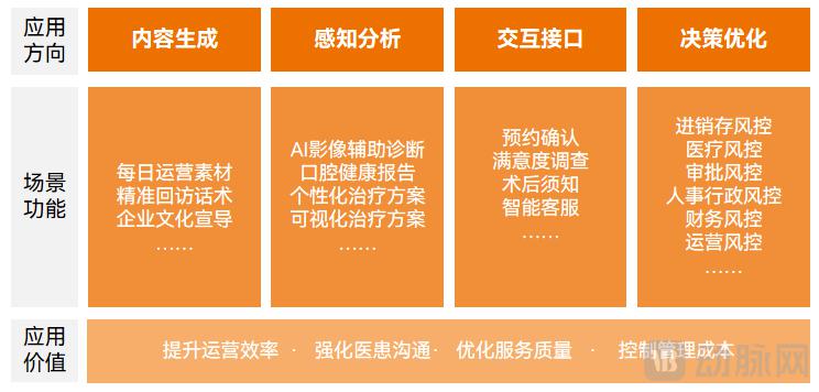 郑程介绍,美维口腔在大数据库集成各类业务数据的基础上,借助开源大模型能力,开展个性化的算法开发与训练,主要从内容生成、感知分析、交互接口、决策优化四大方向全面推进 AI 应用。