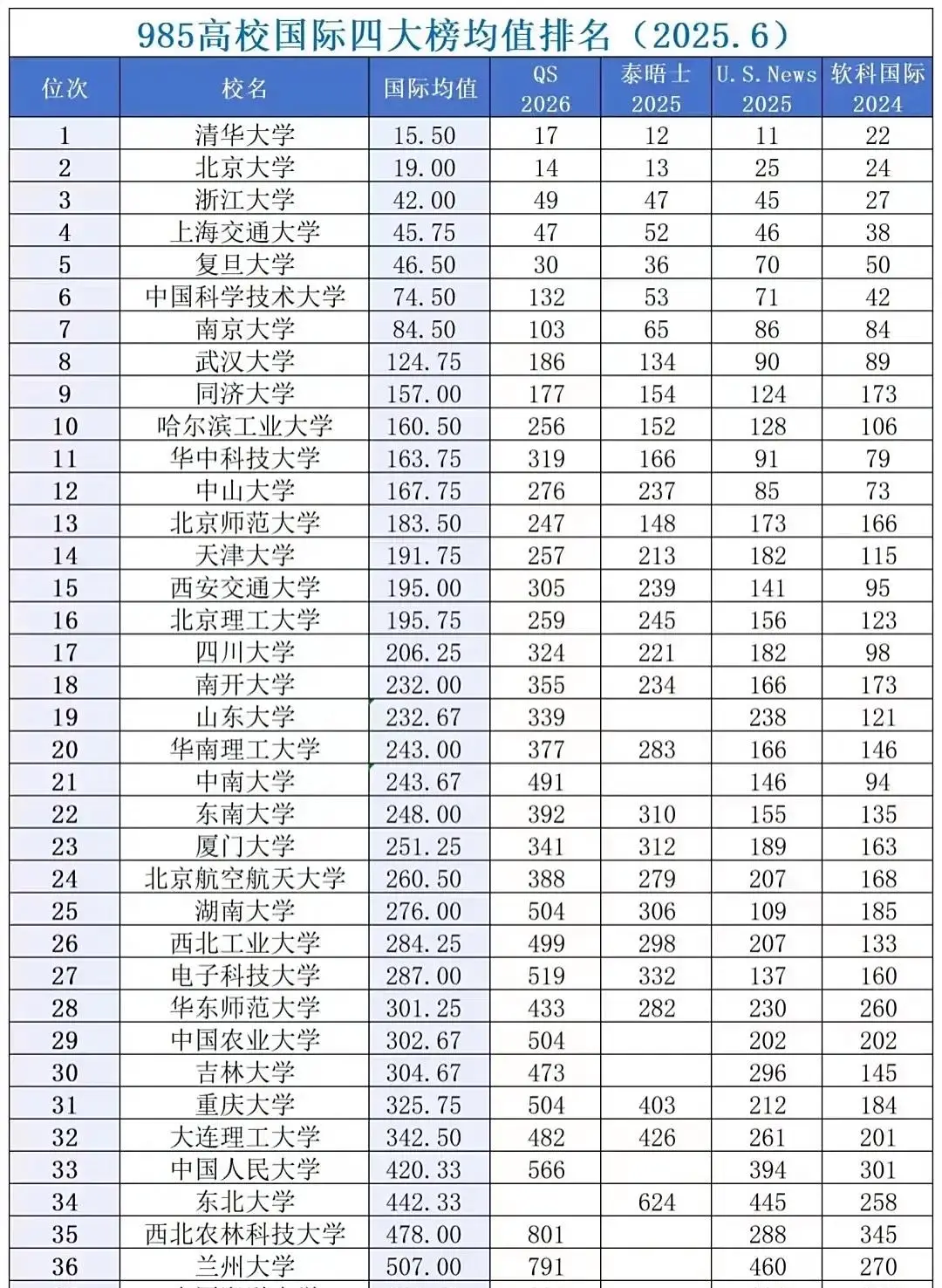 985高校国际四大榜均值排名一出,清华、北大、浙大、上交、复旦依旧牢牢占据前五,中科大、南大、武大、同济、哈工大紧随其后,座次清晰。然而,榜单翻到第33位,中国人民大学赫然在列,国际均值420名开外,与“