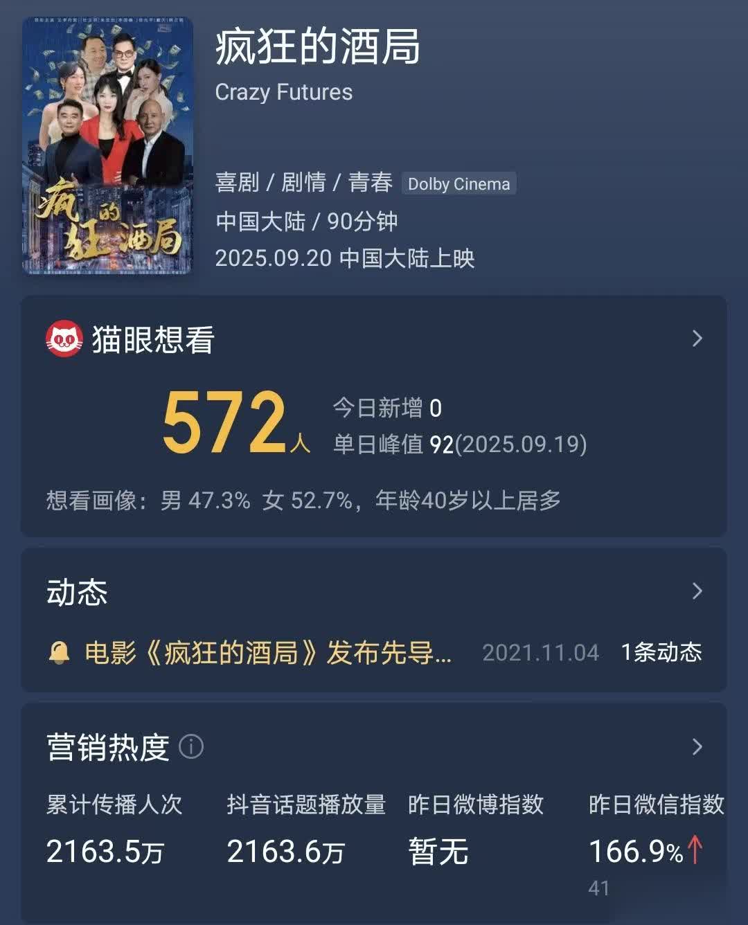 《疯狂的酒局》是于今年9月20日开始上映,到现在差不多已经有四天了,可据国内的电影平台所显示,它却还没有票房数据显示,也就是票房为零。