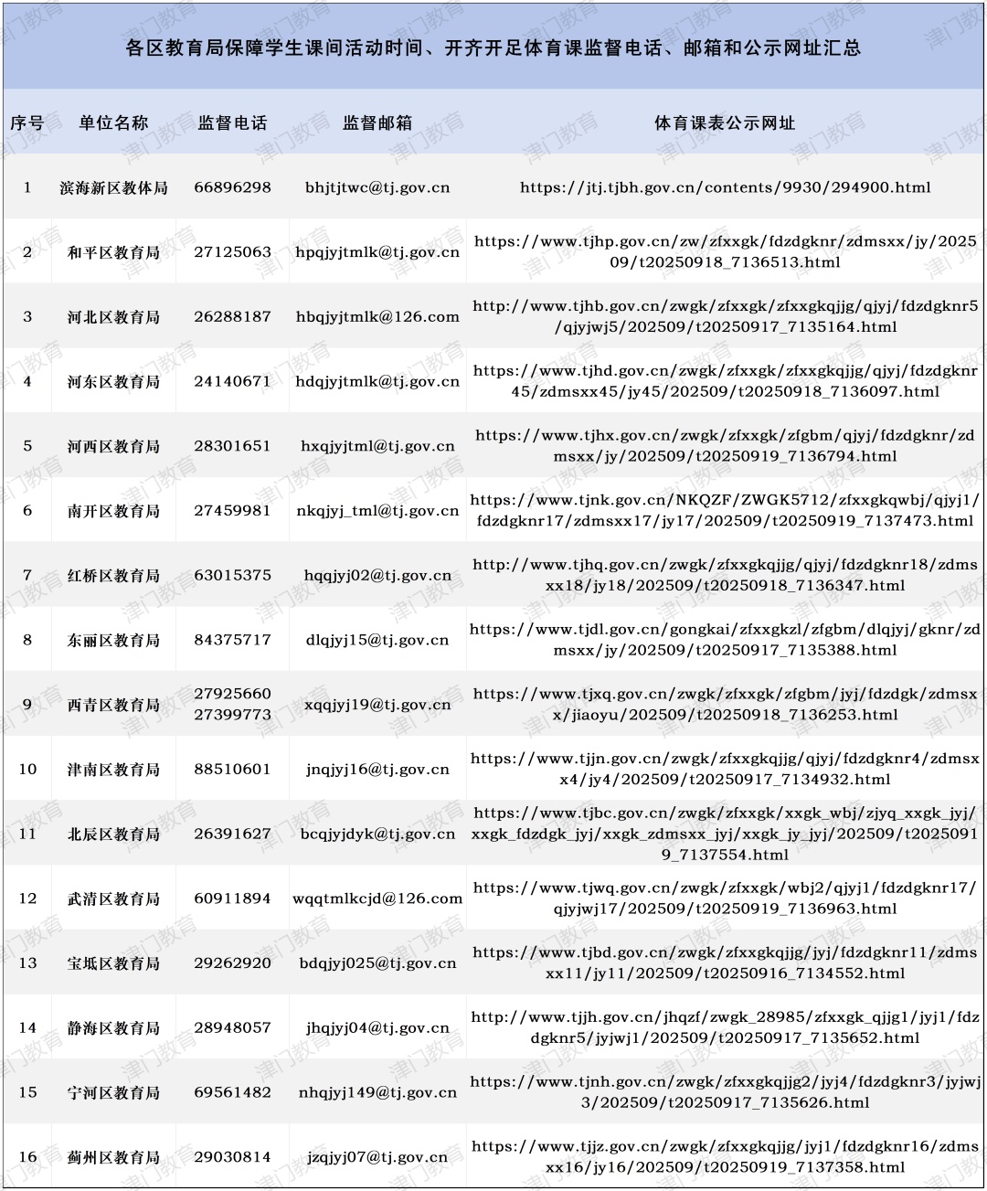为进一步畅通监督渠道,广泛发挥师生家长和社会公众监督作用,保障中小学生每天综合体育活动时间不低于2小时,市教委公布了各区教育局2025年秋季学期保障学生课间活动时间、开齐开足体育课的监督电话、邮箱和体育课“晒课表”网址。
