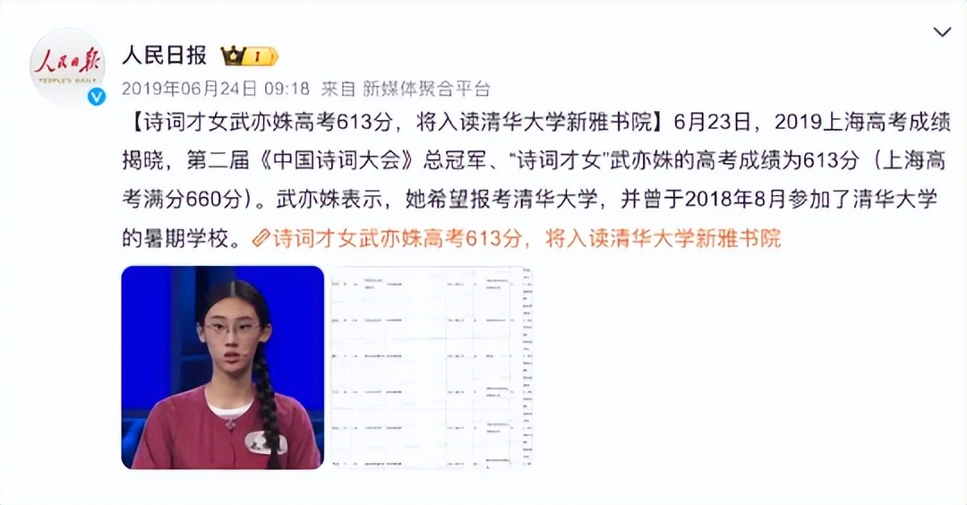 还记得《中国诗词大会》上那个惊艳了全国的“诗词仙女”武亦姝吗? 当年她才16岁一夜之间火遍大江南北,成了无数人心中的“国民才女”。 后来更是一路开挂,以高分考入清华。 但是这位清华才女的现状曝光后,大