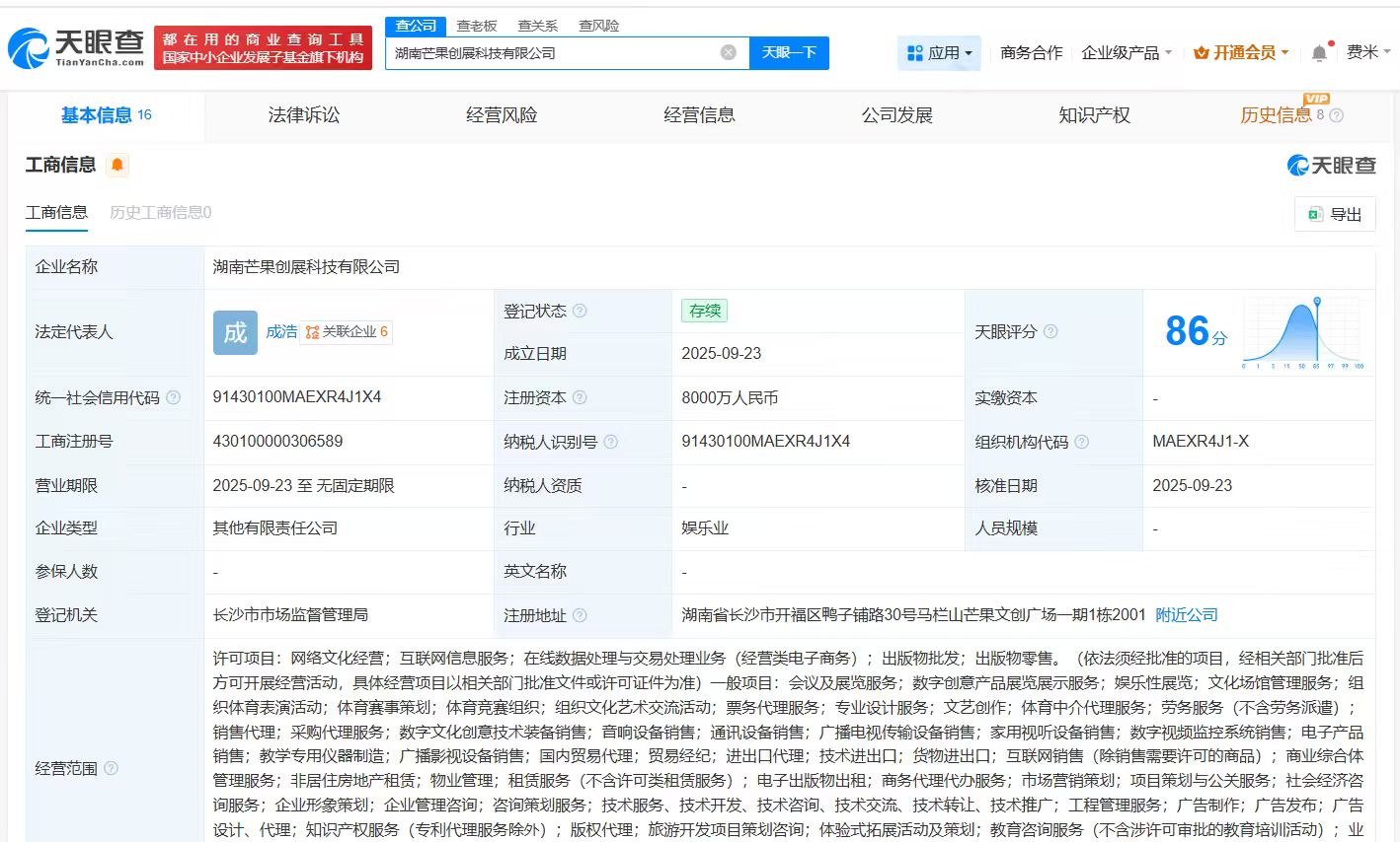 雷达财经讯,天眼查App显示,近日,湖南芒果创展科技有限公司成立,法定代表人为成浩,注册资本8000万人民币,经营范围包括网络文化经营、互联网信息服务、在线数据处理与交易处理业务等。股东信息显示,该公司