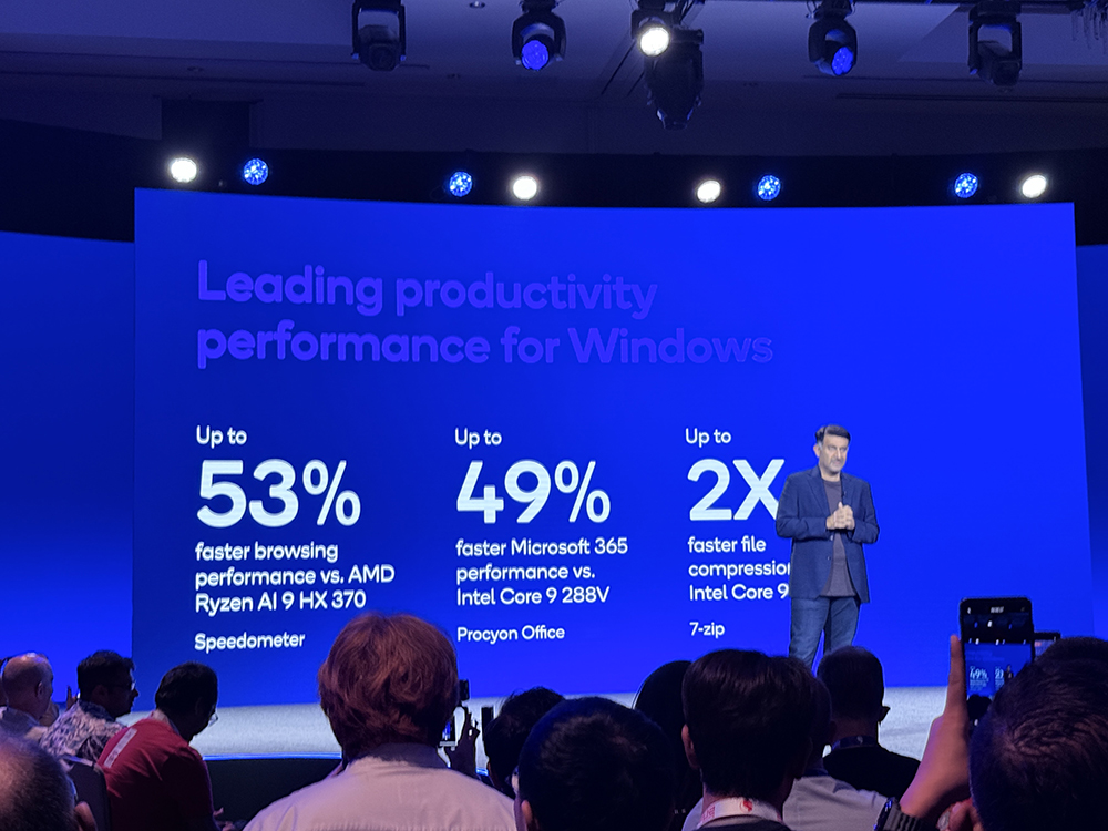 在提升生产力方面,该芯片可实现高达53%的更快浏览速度、49%的办公效率提升,以及比竞品快2倍以上的文件压缩速度。