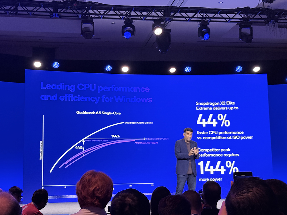 相比竞品,在同样功耗下,骁龙X2 Elite Extreme的CPU单核性能提升44%。竞品实现的同样任务处理,需要多用144%的功耗。