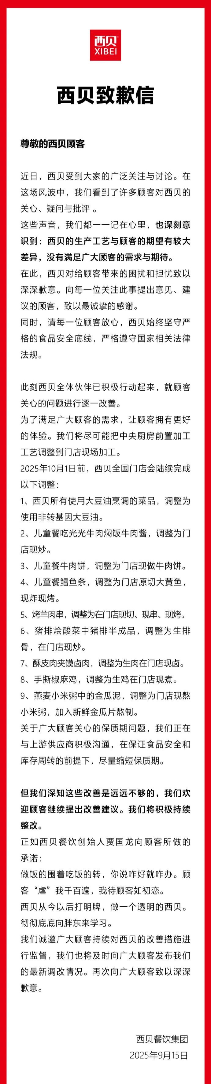 9月15日,西贝官方微博发布致歉信,称深刻意识到,西贝的生产工艺与顾客的期望有较大差异,没有满足广大顾客的需求与期待,在此,西贝对给顾客带来的困扰和担忧致以深深歉意。