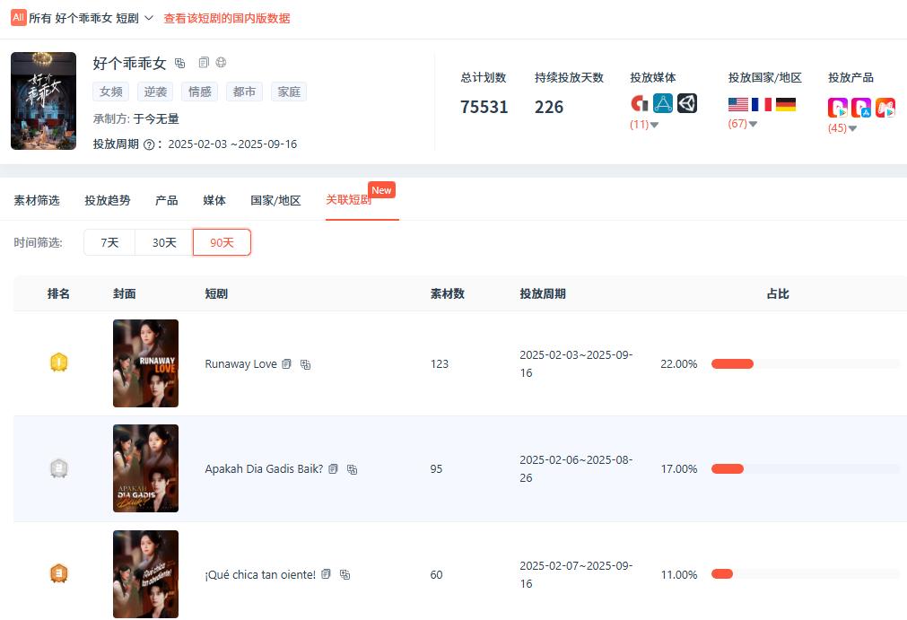 短剧《好一个乖乖女》正是一个成功案例。该剧在创作初期就预留了多语言适配的空间,并提前与海外发行平台协同规划,在国内上线后迅速推出本地化配音和字幕版本。紧随国内推广期结束,泰语、日语、韩语等版本也陆续上线,为多市场同步推进奠定了坚实基础。截至目前,该剧在海外已持续投放226天,累计热度突破千万,展现出优异的长 期运营潜力。