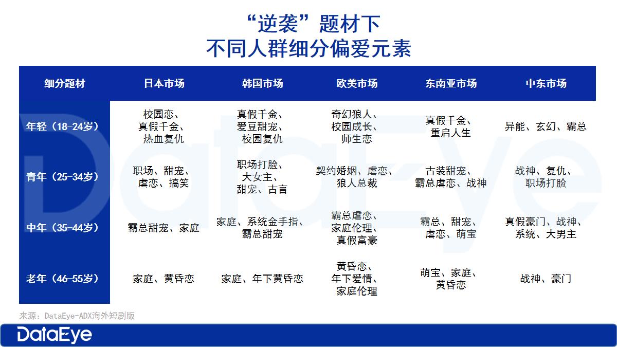进一步从人群年龄层次来看,逆袭题材的内容偏好同样存在显著差异。以北美市场为例, TikTok 上热投的爆款素材显示,年轻观众更关注校园纯爱、成长逆袭类内容;中青年群体则更青睐职场逆袭与甜宠元素的结合;而老年群体则明显偏爱家庭伦理背景的逆袭故事,如婆婆反击恶毒儿媳,或60岁总裁隐藏身份最终翻身等情节。这种年龄分层偏好特征在其他市场也同样存在,显示出逆袭题材在不同受众中的多样化表达潜力。