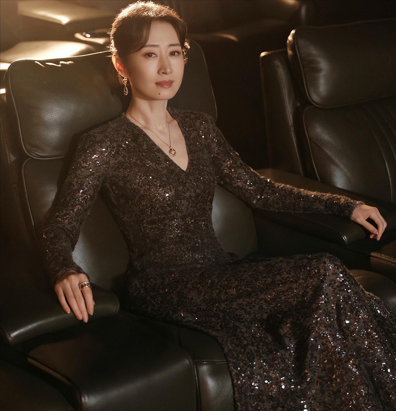 这场活动中她打扮的非常端庄大气,穿了一件深棕色的亮片长裙。
